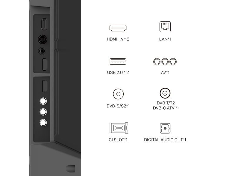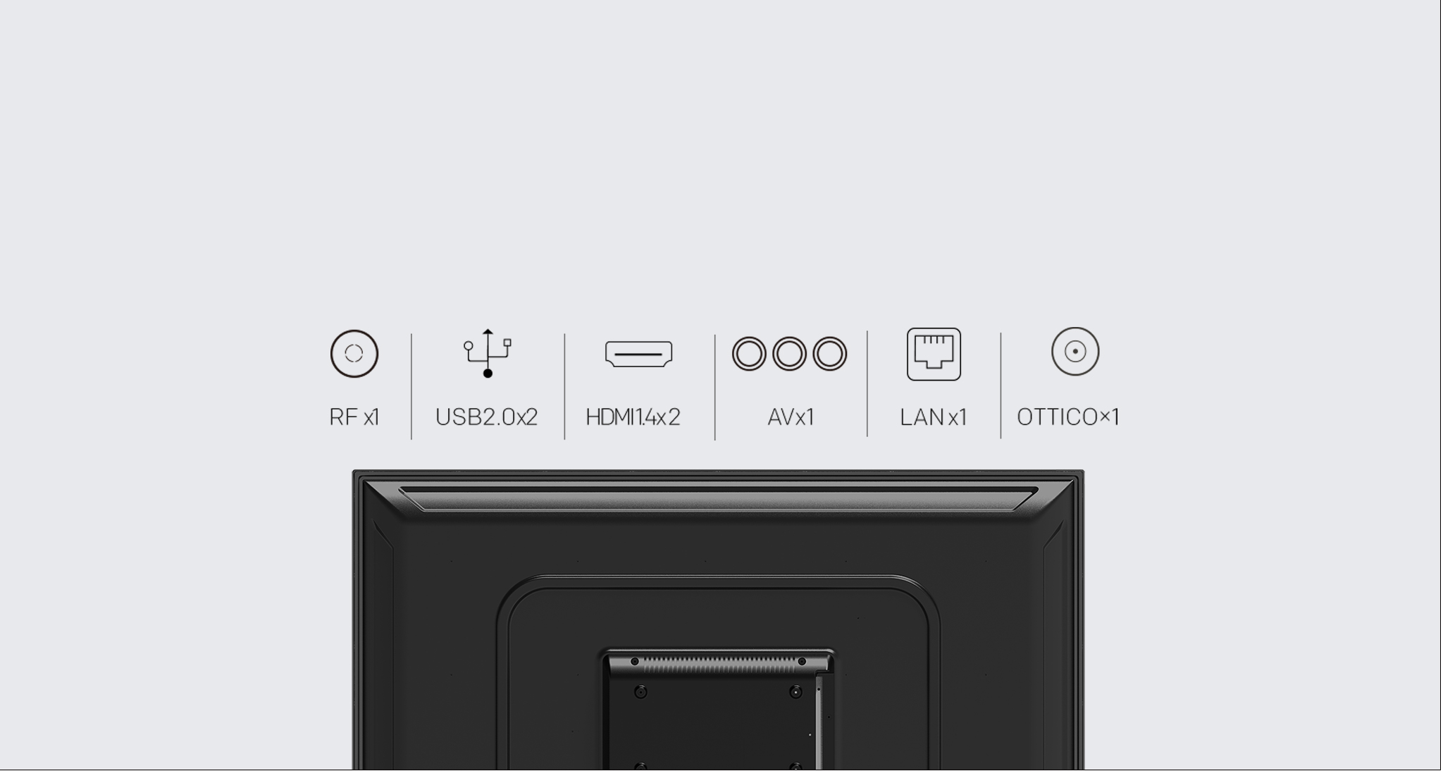 RF × 1 USB2.0 × 2 HDMI1.4 × 2 AV × 1 LAN × 1 óptica × 1