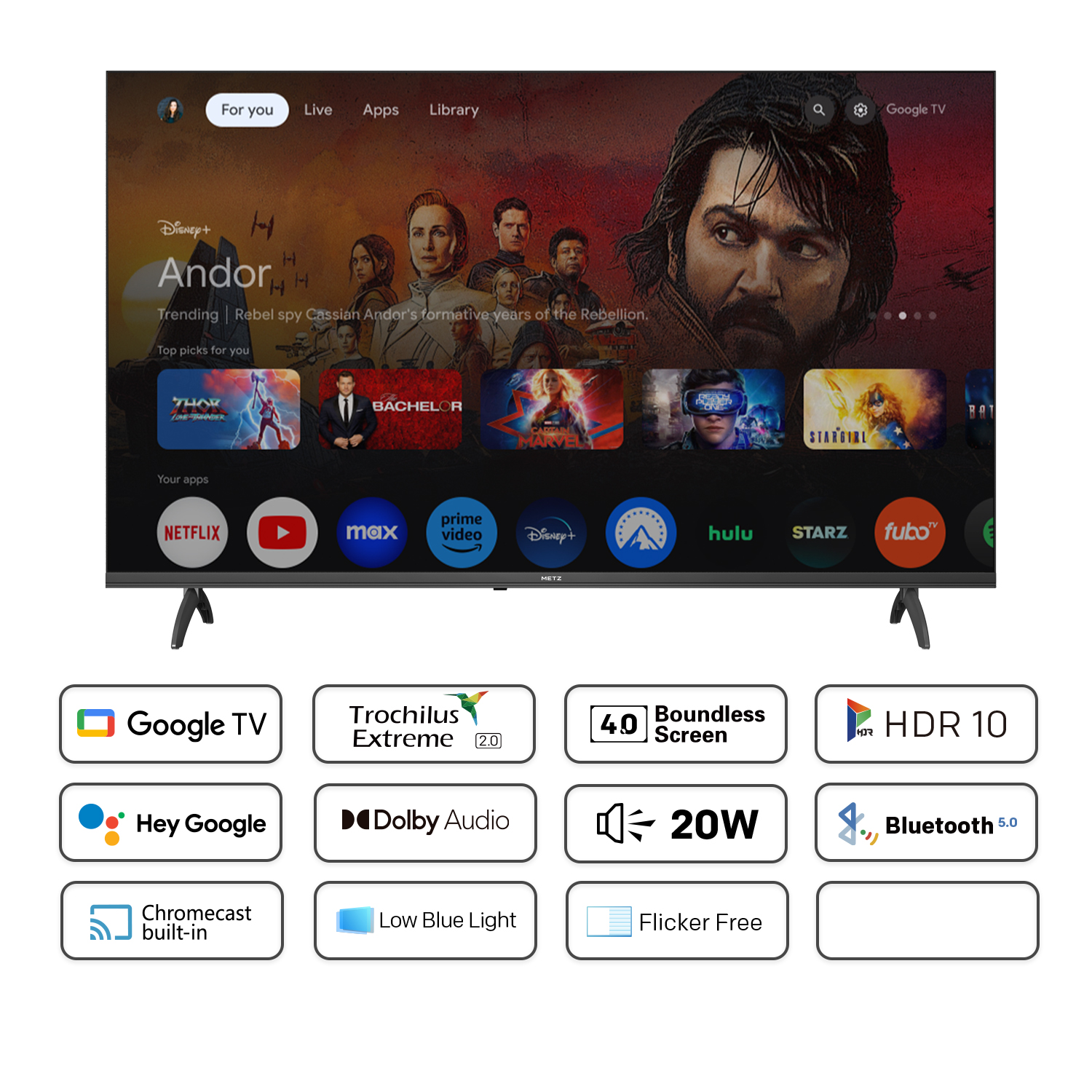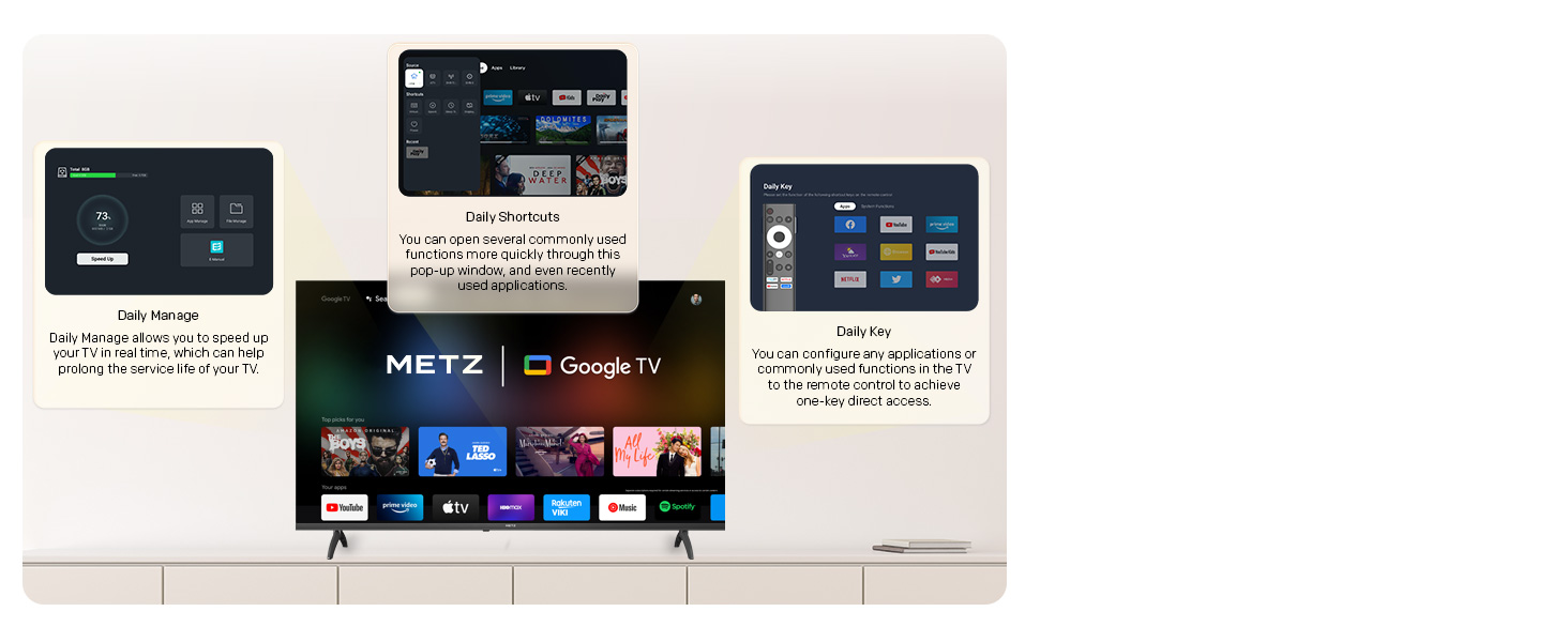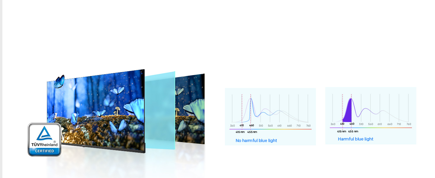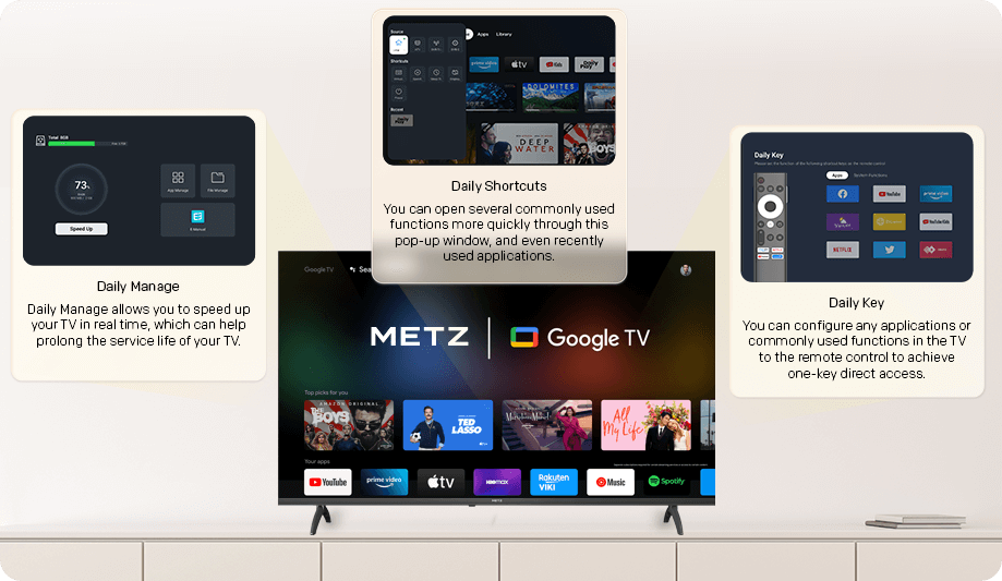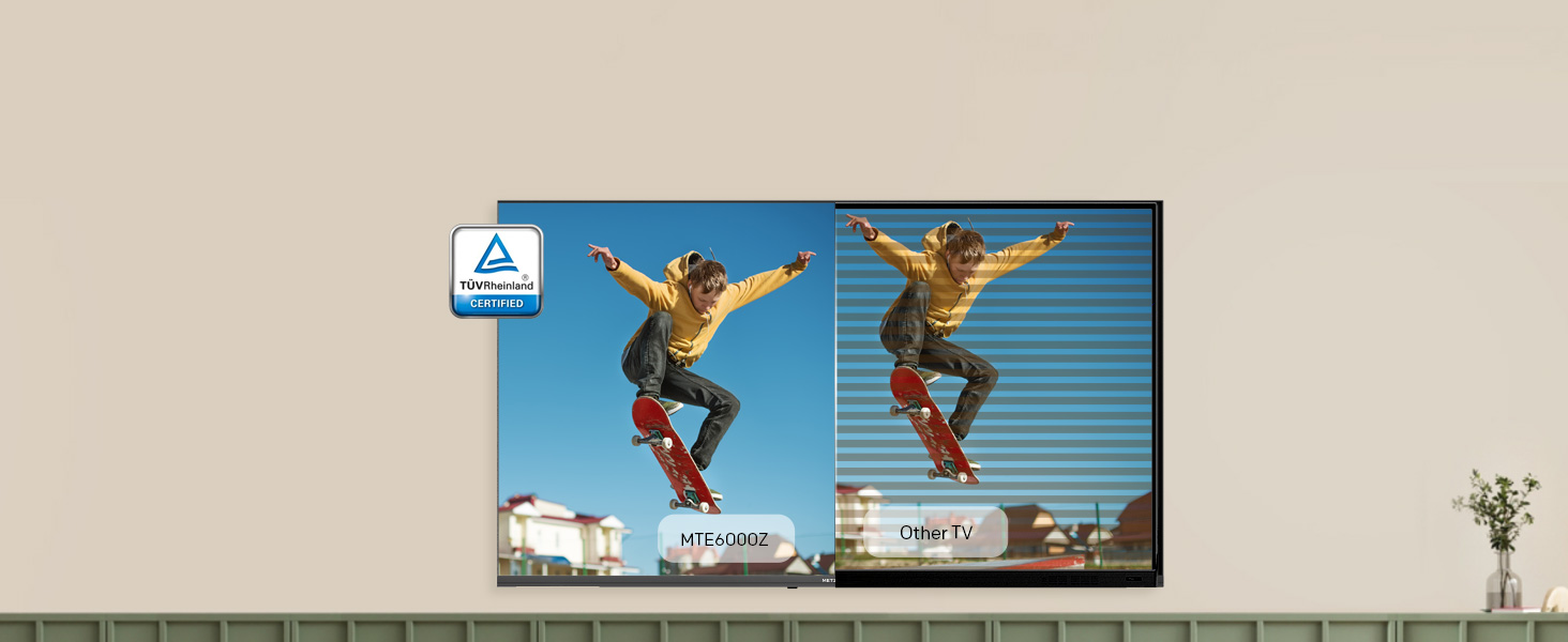 Metz TV con baja luz azul, parpadeante y ajuste de manera inteligente la tecnología de fondo de fondo, lo que le permite a usted y a su familia disfrutar de la visualización de la televisión sin preocuparse por la fatiga visual.